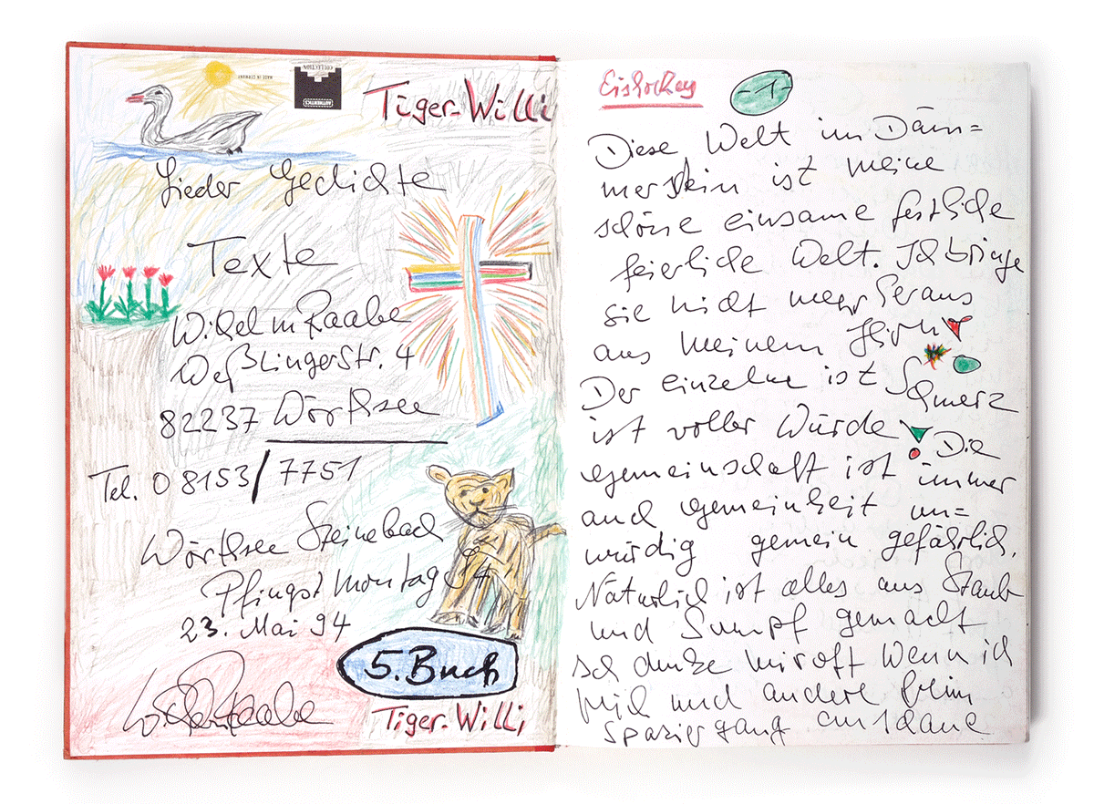 Dieses ständigen Wiederbearbeiten früherer Einträge macht aus den Notizbüchern des Tiger Willi erst den oftmals kaum mehr durchdringbaren Urwald aus Worten, Zeichnungen und hineingeklebten Computerausdrucken fertiger Lied- und Gedichttexte, den er immer wieder im Nachhinein mit Kritzeleien, Wortgirlanden und Buntstiftzeichnungen weiter verdichtet hat. Pfade führen durch diesen Dschungel, die der Tiger immer wieder beschritten und im Lauf der Jahre mit Wegweisern in Form farbiger Pfeile, Kreise und Zahlen markiert hat.